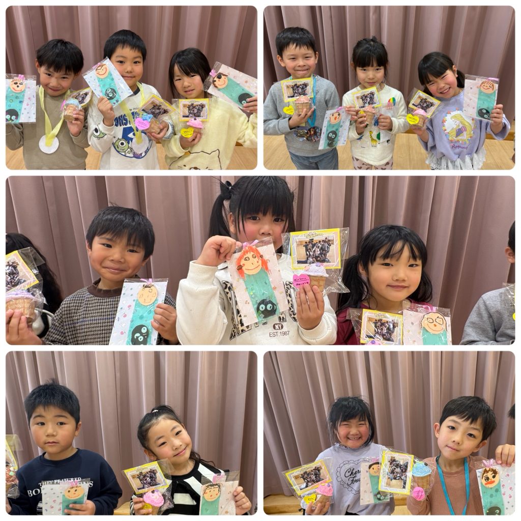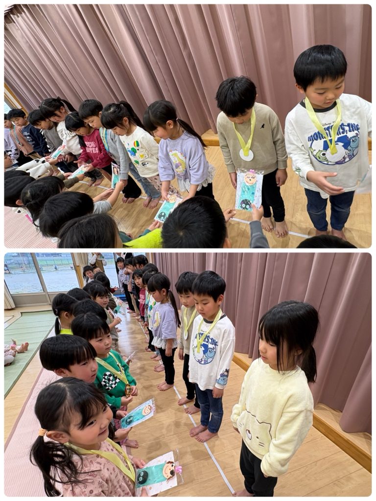プレゼント渡しでは、ひまわり組のお友だちへメッセージを伝えながらプレゼントを渡しました。中には寂しさから涙を見せる子どももいました😢