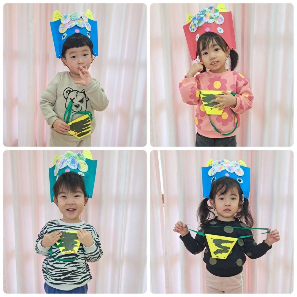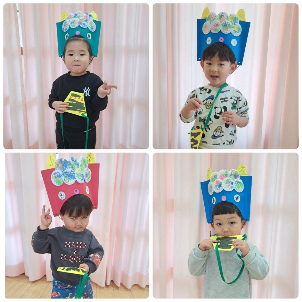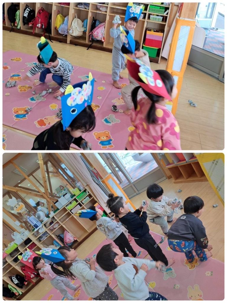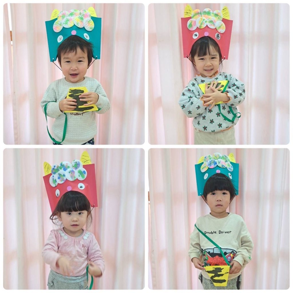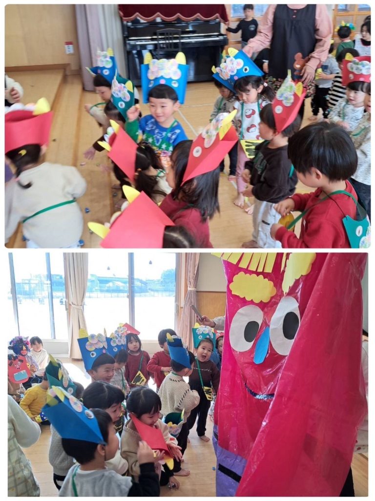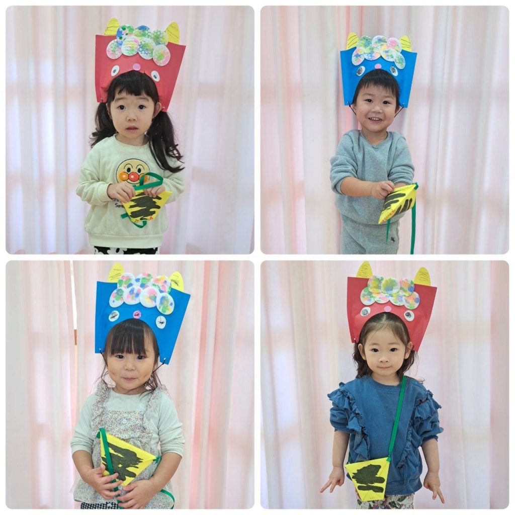 2月といえば節分👹子どもたちは手作りお面をかぶり新聞紙で丸めた手作り豆で「おには外ー!」と豆まきの練習をして