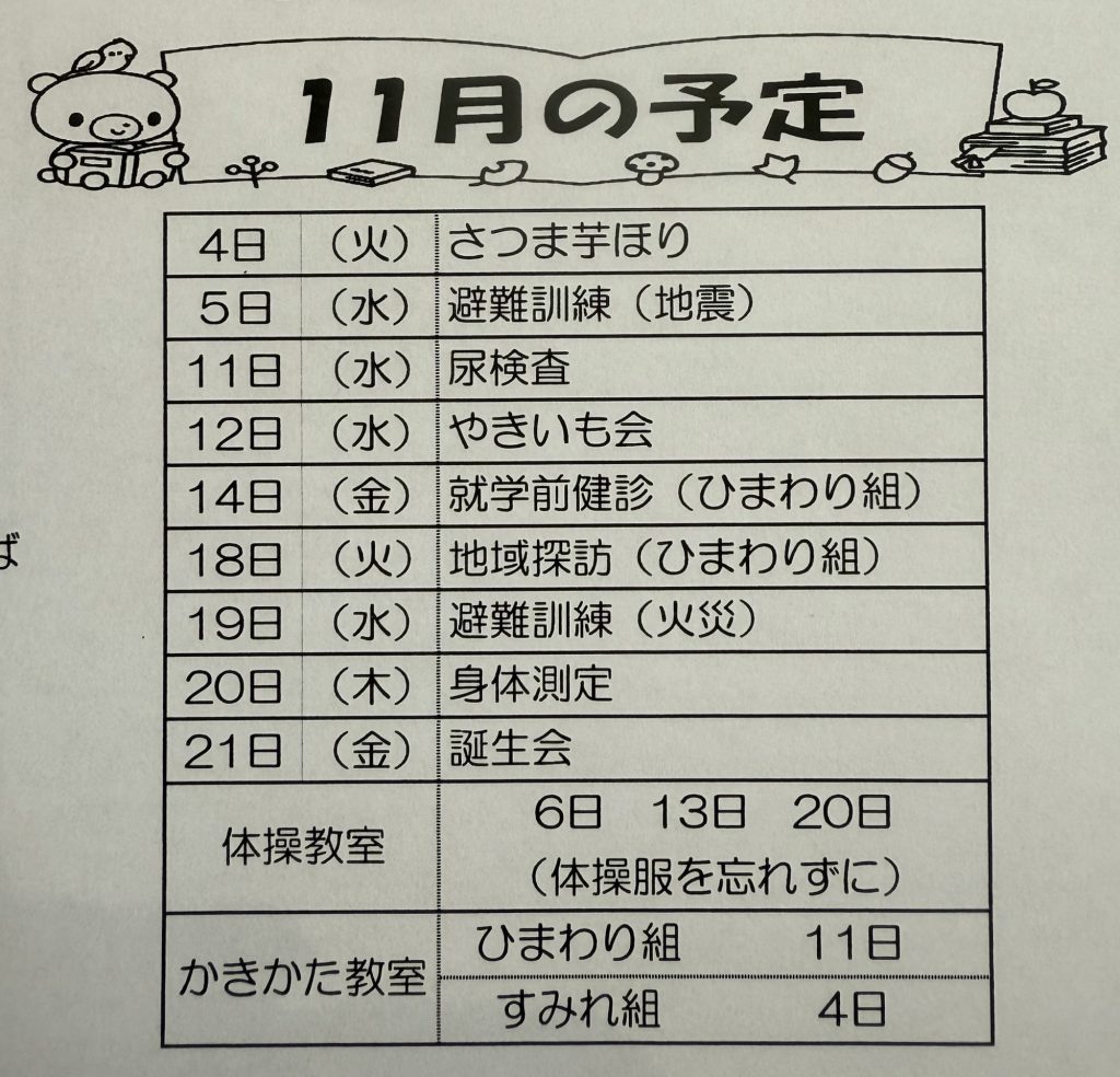 🍁11月 行事予定🍁 今月の行事予定はこちらとなってます💁♀️✨ 関連記事 🍁11月 行事予定🍁 今月の行事予定です💁♀️✨ 公開済み: 2024年11月1日更新: 2024年11月21日作成者: kouzakiadminカテゴリー: 今月の行事予定 ☂️6月 行事予定🐸☂️ 今月の行事予定はこちらとなります💁♀️✨ 公開済み: 2025年6月1日更新: 2025年5月29日作成者: kouzakiadminカテゴリー: 今月の行事予定 🐸6月 行事予定🐸 今月はこちらとなります💁♀️ 公開済み: 2024年6月1日更新: 2024年5月30日作成者: kouzakiadminカテゴリー: 今月の行事予定