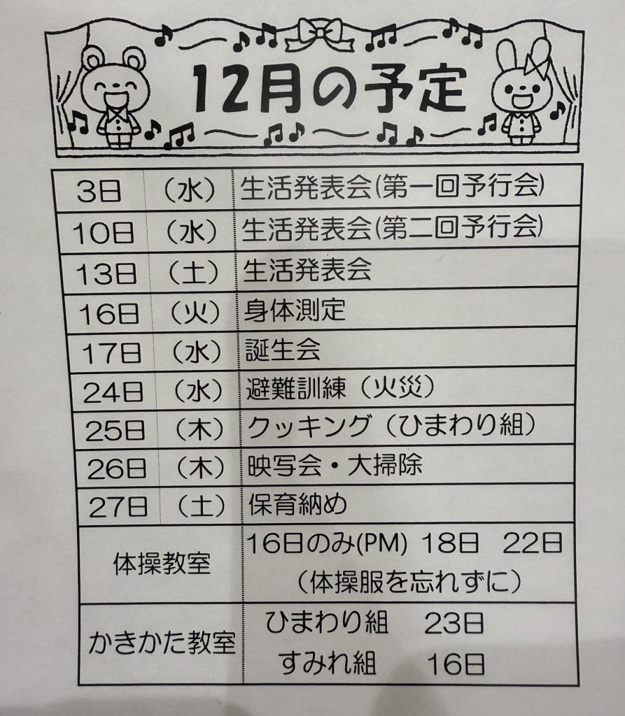 🎄12月 行事予定🎅🎄 今月の行事はこちらでございます💁♀️ 関連記事 🎃10月 行事予定🎃 今月の行事予定です🥺🎶 公開済み: 2024年10月1日更新: 2024年10月5日作成者: kouzakiadminカテゴリー: 今月の行事予定 🐸6月 行事予定🐸 今月はこちらとなります💁♀️ 公開済み: 2024年6月1日更新: 2024年5月30日作成者: kouzakiadminカテゴリー: 今月の行事予定 🌻8月 行事予定🌻 今月の行事予定はこちらです💁♀️✨ 公開済み: 2025年8月1日更新: 2025年8月7日作成者: kouzakiadminカテゴリー: 今月の行事予定
